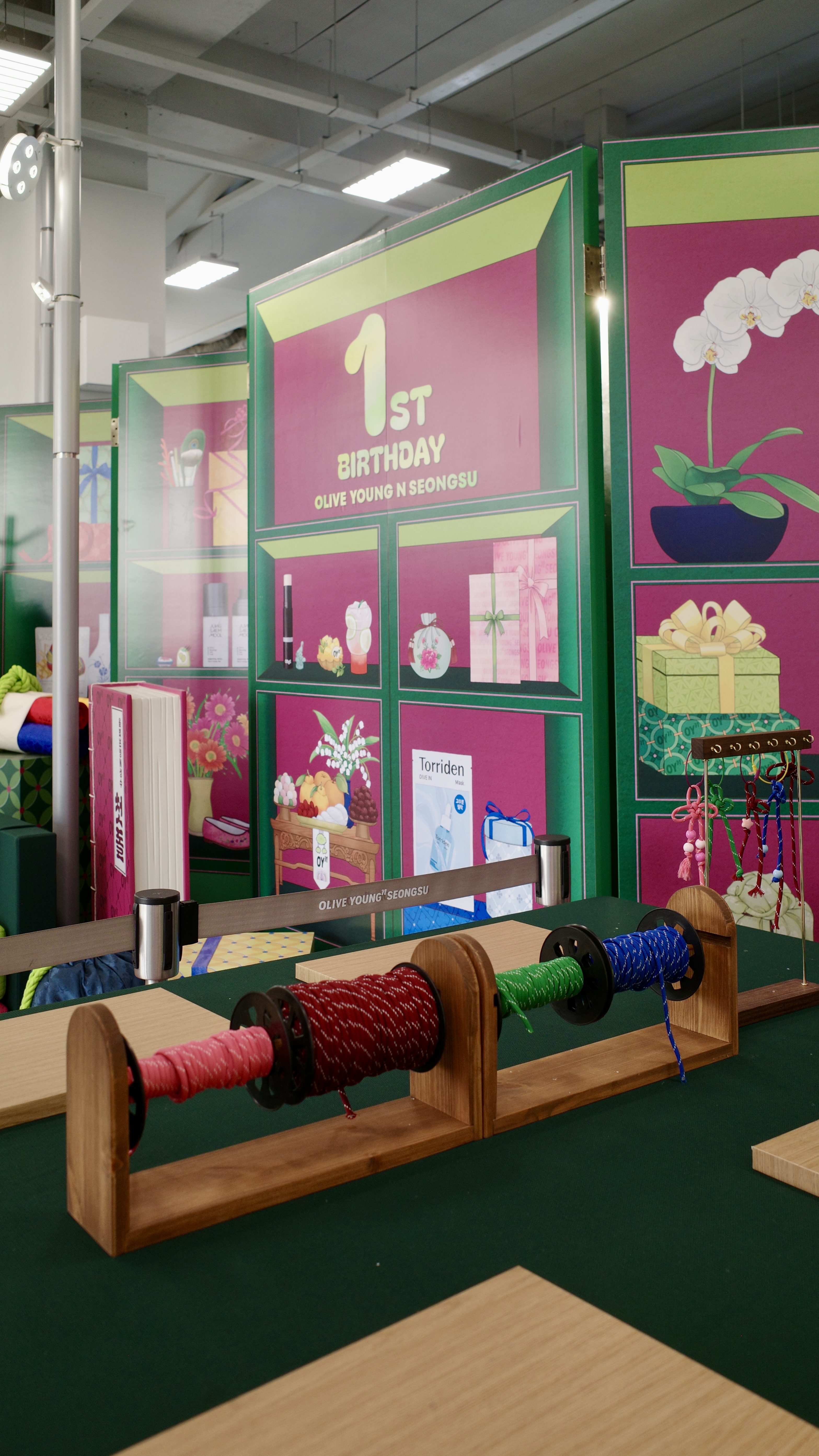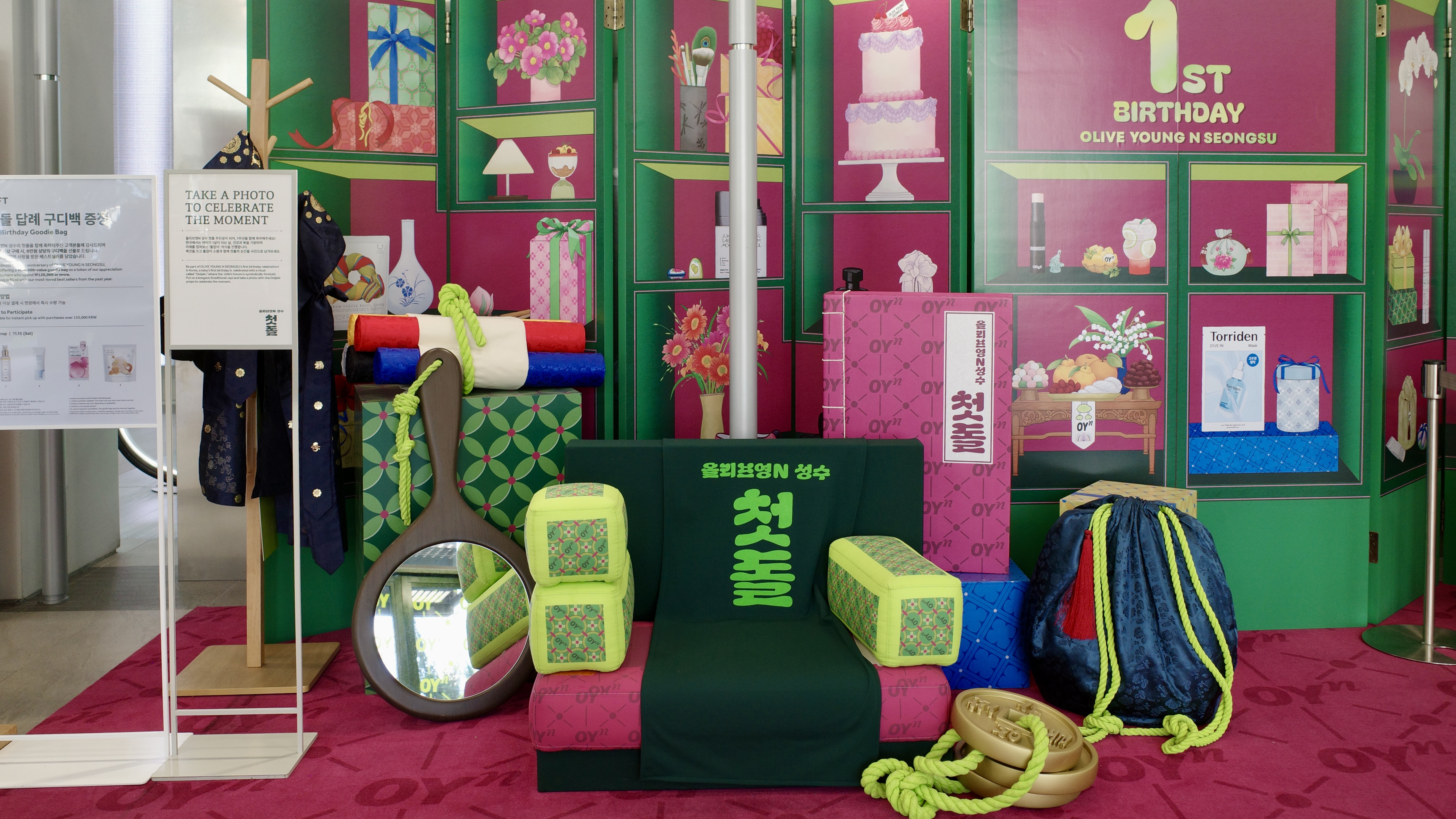 올리브영N 성수는 1주년을 맞아 매장을 '첫 돌' 콘셉트로 꾸미며 또 한 번 성수다운 감각을 드러내고 있습니다. 이번 연출은 단순히 생일을 축하하는 장식에 그치지 않고, 한국 전통 '돌잔치'라는 문화적 코드를 브랜드 경험 속으로 세련되게 녹여낸 점이 가장 돋보이는데요.