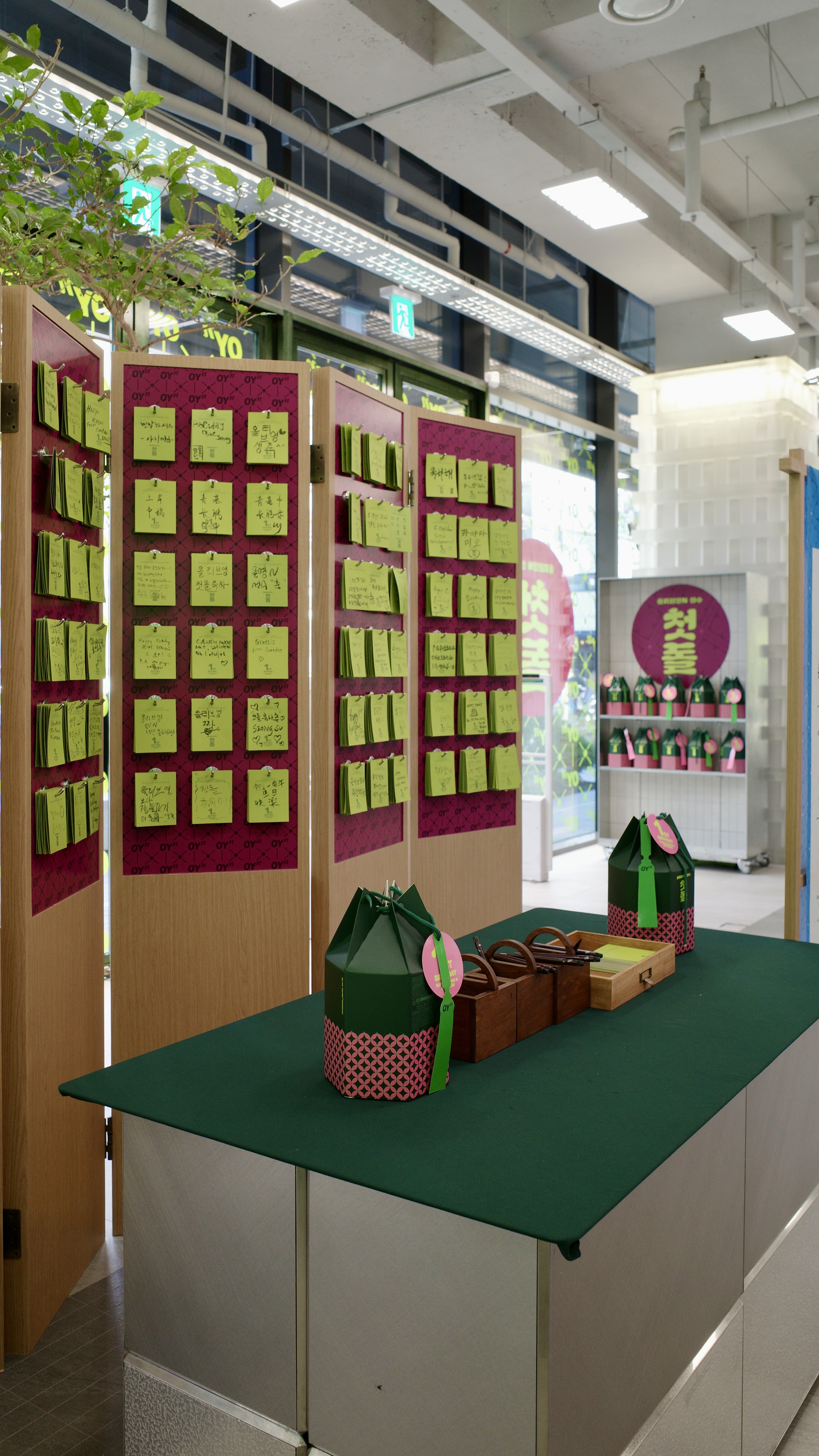 매장 곳곳에는 전통 돌잡이를 연상시키는 오브제와 손님이 직접 참여할 수 있는 체험형 장치들이 배치되어 있습니다. 돌잡이 상에서 가져갈 법한 물건을 모티프로 한 상품 전시 연출, 전통 매듭 기법을 체험하도록 한 경험 요소, 그리고 방문객이 메세지를 남기며 참여감을 느낄 수 있는 방명록 콘셉트의 체험 콘텐츠 등이 자연스럽게 흐름 속에 배치되어 있어요. 그 자체로 하나의 전시형 콘텐츠처럼 작동하며, 1층 공간을 걸어다니는 것만으로도 '한국의 첫 돌 문화'를 직관적으로 경험하게 되어있어요.